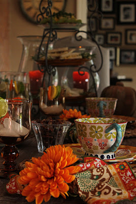 No table is complete, in my opinion, with 5 to 7 little glass votives with white candles in them. The light sparkles and makes everything else on the table more beautiful and sets a soft, relaxing, often more romantic tone.