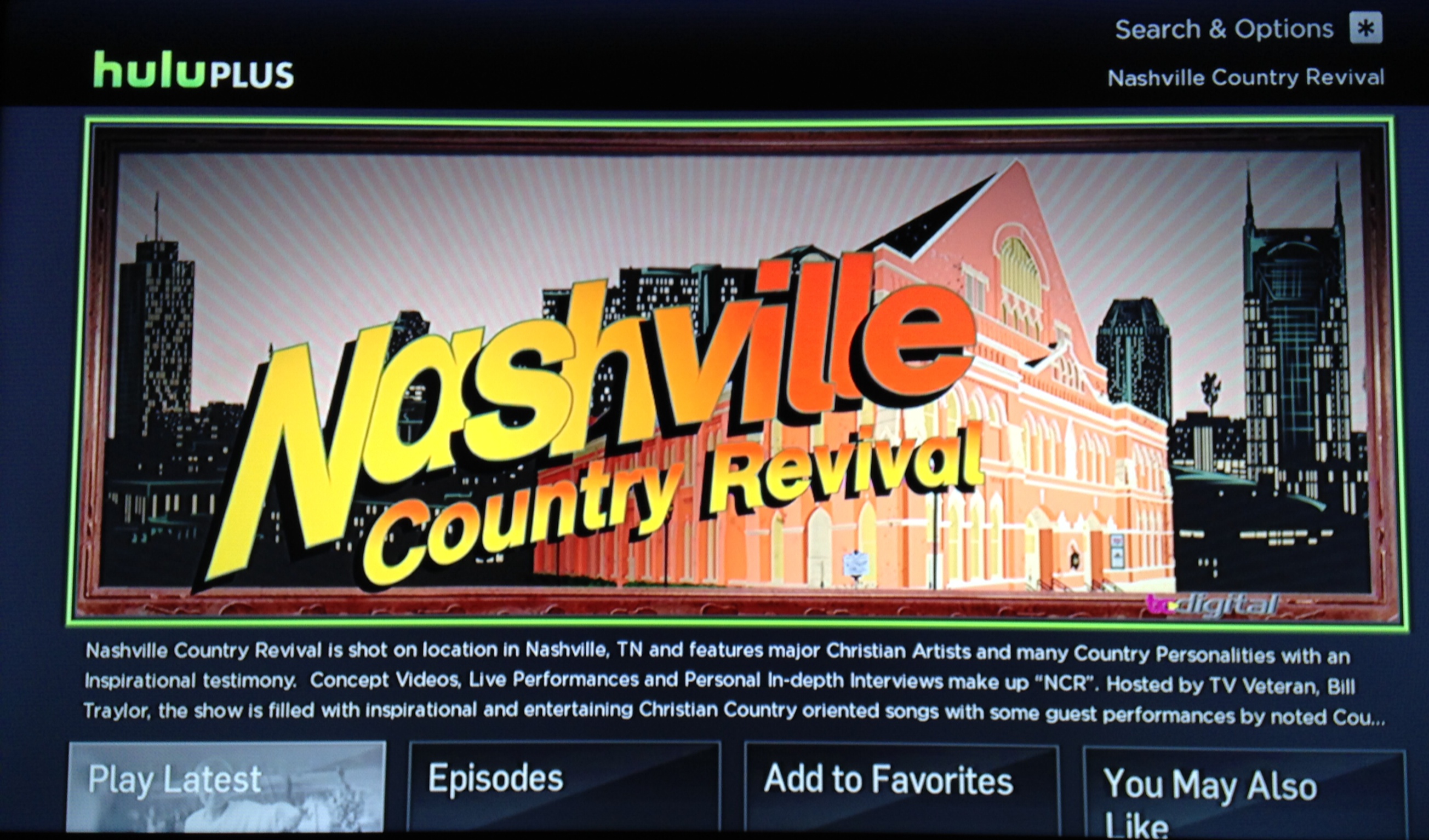 Franklin, TN (Mansion Entertainment) August 22nd, 2014 – The popular Nashville Country Revival TV show has already been seen by Gospel Music fans in the past 2 years on traditional TV networks such as Daystar, Heartland TV, TCT and a host of other national, network platforms. NCR has entered new territory for Gospel oriented music as nine episodes of Nashville Country Revival have now been launched on Hulu. Amazon Prime will come on board in the near future offering Nashville Country Revival episodes to its subscriber base and viewership as well.