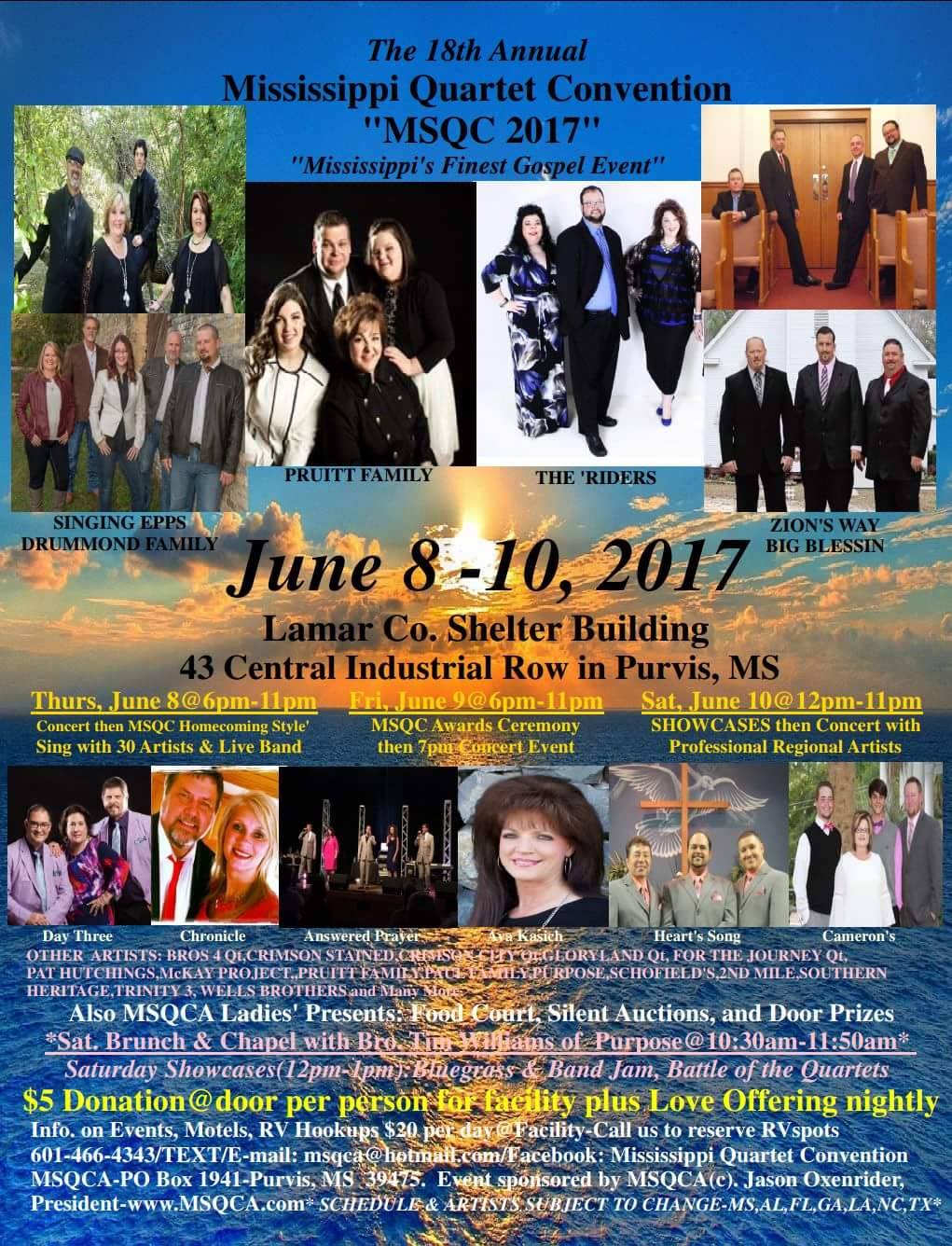 The 18th Annual Mississippi Quartet Convention will be held June 8-10, 2017 at the Lamar Co. Shelter Building in Purvis, MS.  The event will feature over 25 Gospel Artists of varying styles from the states of MS, AL, FL, GA, LA, NC, TN, TX.  Thursday will start with Concert and MSQC Homecoming Style Sing themed “Songs from The Perry’s” with Artists and Live Band.  Friday morning will feature  Men’s Golf Tournament and Ladies’ Inspirational Tea with special speaker Leslie McKay of McKay Project.  Later that evening will have MSQC Awards Ceremony and Concert .  On Saturday morning we will have Chapel Service with Rev. Tim Williams of Purpose followed by showcases  “Band Jam”, “Battle of the Quartets”, then all day Gospel Music.  $5 Donation at Door for facility costs and Love Offering taken nightly.  RV Hookups available to rent Call 601-466-4343 for more event information.