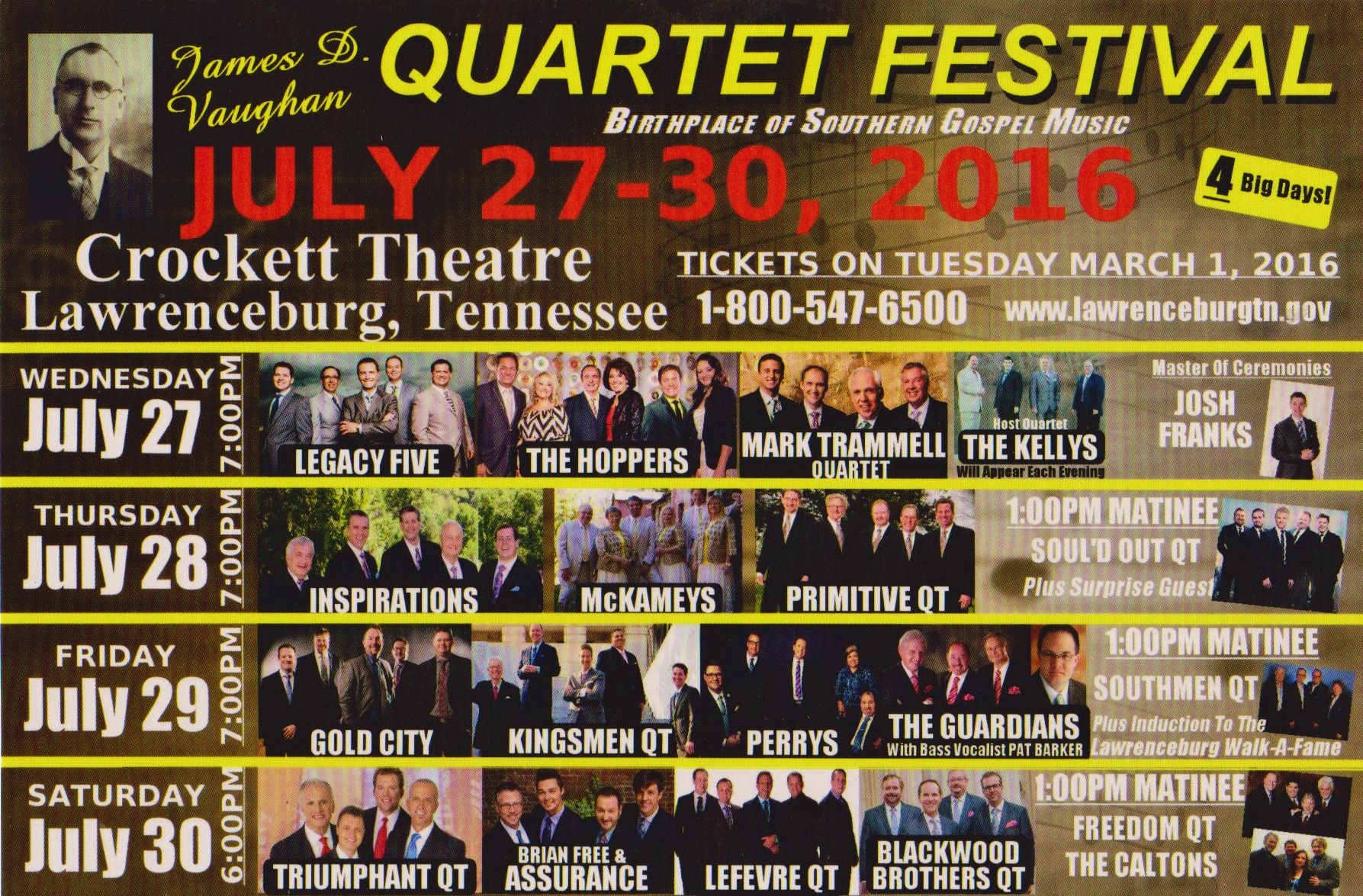 The birthplace of southern gospel music, Lawrenceburg, TN host the annual all quartet festival beginning on Wednesday July 27 and continuing through Saturday July 30. The southern gospel festival kicks off Wednesday evening, July 27 at 7:00p.m. with a first time performance by “Legacy Five”. Also appearing; “the Hoppers”, as seen on the Bill Gaither Homecoming Tour, and “the Mark Trammell Qtâ€. On Thursday July 28 at 7:00PM, will be Inspirational Night featuring “the Inspirations”, “the McKameys”, and the “Primitive Quartet”. Friday evening July 29, at 7:00p.m. the Festival welcomes the most awarded quartet “Gold City”, the mighty “Kingsmen Qt”, America’s favorite mixed quartet “the Perrys”, and a special performance by “the Guardians†with guest bass vocalist, Pat Barker. To cap off the festival, Saturday July 25 beginning at 6:00p.m., its an all-star night with America’s number one quartet “Triumphant Qt”, “Brian Free & Assurance”, “LeFevre Qt†and the oldest traveling quartet on the gospel road, the “Blackwood Brothers Qt”.