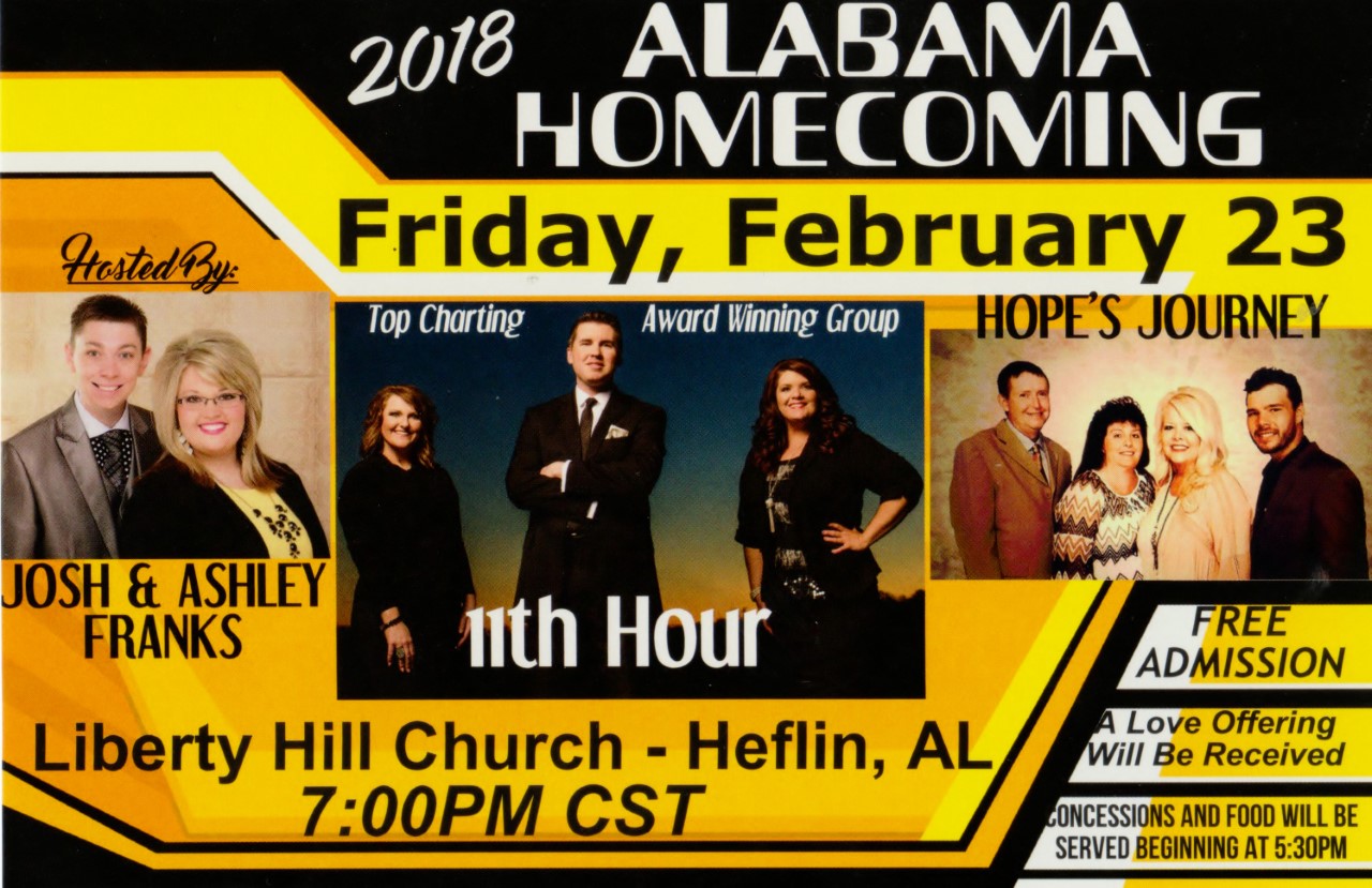 JAF PROMOTIONS PRESENTS the “ALABAMA HOMECOMING” gospel concert on Friday, February 23 at 7:00PM at the Liberty Hill Church, off Hwy 431, in Heflin, AL. Host artist and Singing News Top New Artist of the year, Josh & Ashley Franks have included special guest, 11TH HOUR, southern gospel’s rising trio, and Heflin’s own, Hope’s Journey. Concessions will be served at 5:30pm. The concert is free admission, however a love offering will be received. For more information visit www.joshandashleyfranks.com