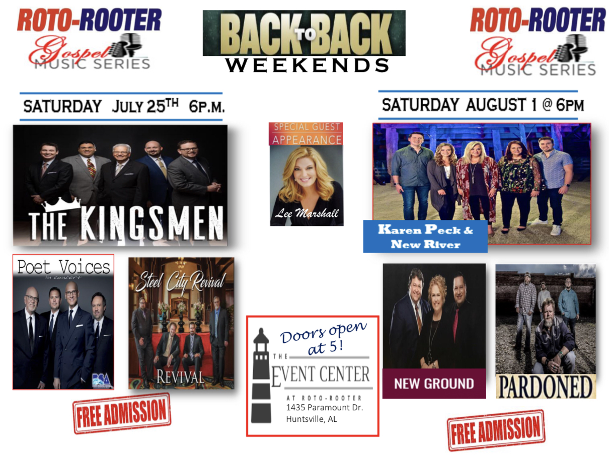 Doors will open at 5pm for each concert and admission is free. A love offering will be received. Only 325 chairs will be set out to maintain social distancing guidelines. The Event Center at Roto-Rooter is located off University Drive at 1435 Paramount Drive. For more information call 256-656-3330.