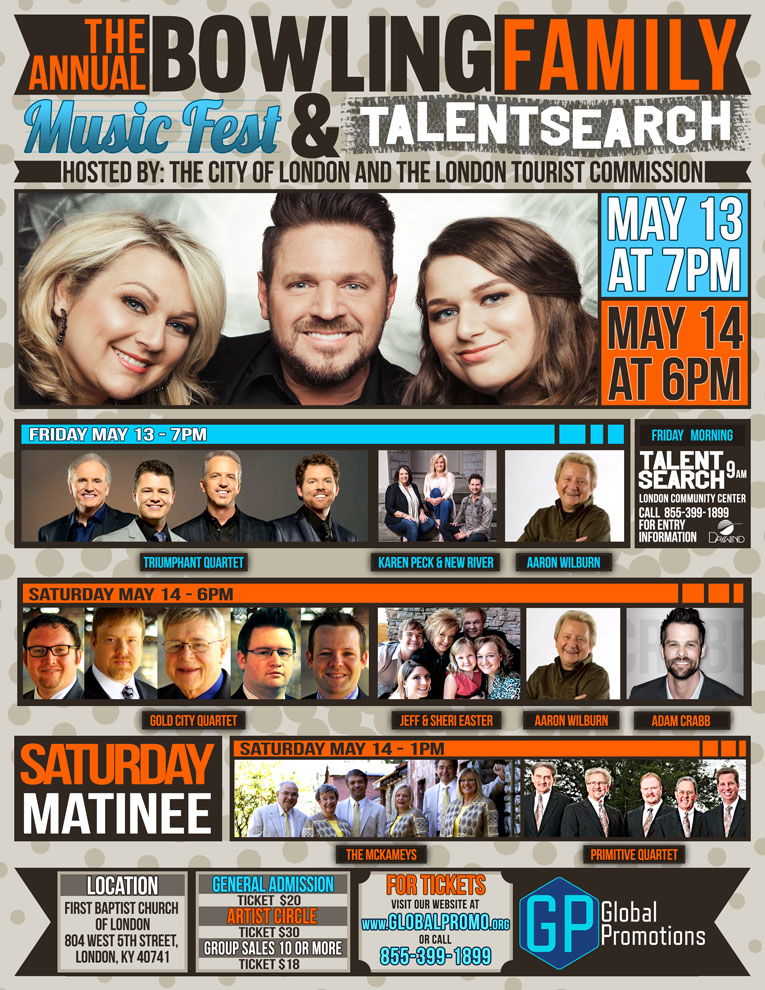 Spartanburg, SC (June 23, 2015) Three time Grammy nominated Southern Gospel artist, The Bowling Family, announce their First Annual Music Fest and Talent Search hosted by the City of London and the London Tourist Commission in conjunction with Global Promotions. This exciting two day event will take place on Friday, May 13th, 2016 and Saturday, May 14th, 2016 at the First Baptist Church of London, 804 West 6th Street, London, Kentucky.