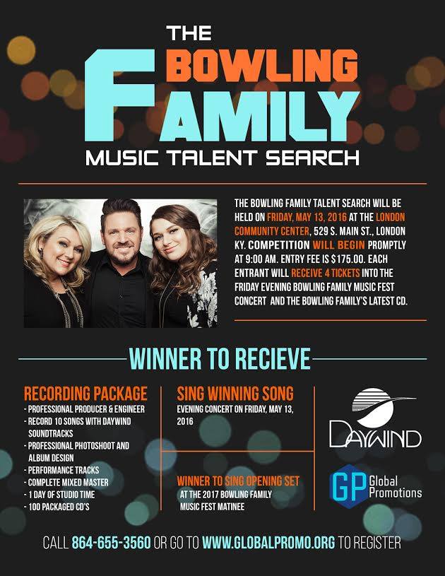 Mike Bowling had this comment about the Talent Search “Do you have talent? Well come be a part of our Talent Search on May 13th in London, Kentucky. The winner will receive a Daywind Record package, perform the winning song at the Friday night concert, and open for us at the 2017 Bowling family Music Fest Matinee. Enter today by calling 864-655-3565 and talking to Teresa or going to www.globalpromo.org and selecting the Events tab and the Bowling Family Music Fest – then scroll to the bottom where you will find all the rules and application. Fill out the application and email it to email@globalpromo.org. See you in London.”