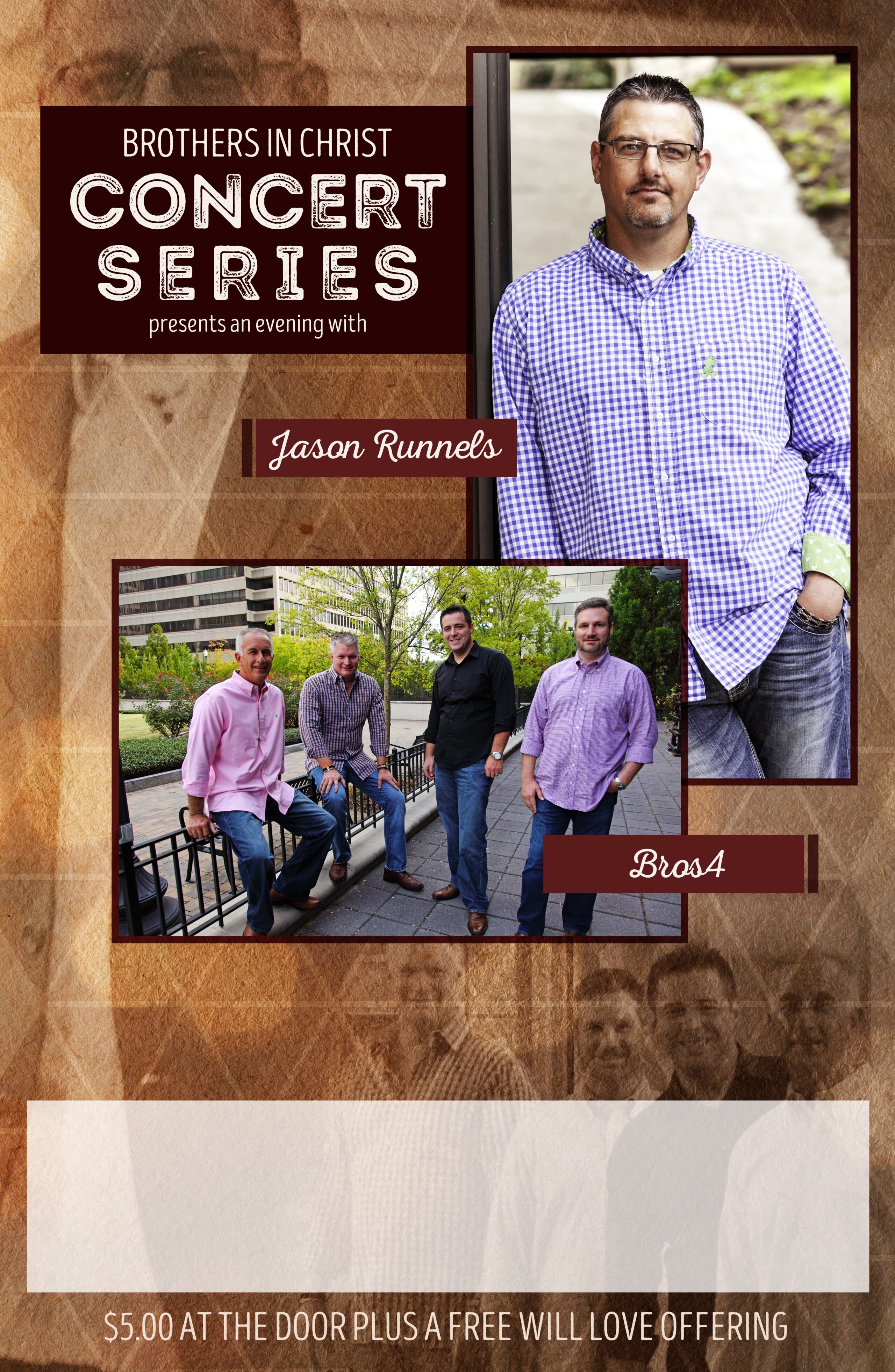 Clinton, MS — Beginning in April 2016, BROS.4 and Jason Runnels will begin an annual concert series entitled Brothers In Christ.  The Brothers In Christ concert promotions will be comprised of annual gospel concerts in the Southeast, including Alabama, Louisiana, and Mississippi.  The inaugural concerts have been scheduled as follows: