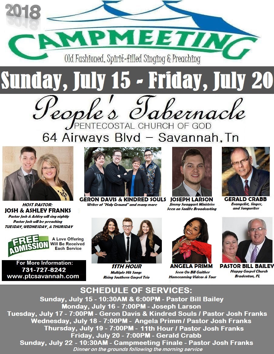 People’s Tabernacle Church, 64 Airways Blvd, Savannah, TN will host, “CAMPMEETING 2018”, beginning Sunday, July 15 and continuing until Friday July 20. Six days filled with old fashioned, anointed, preaching and singing with different guests each evening. Sunday, July 15 at 10:30am & 6:00pm, guest speaker, Pastor Bill Bailey; Monday July 16, 7:00pm, Joseph Larson from Jimmy Swaggart Ministries; Tuesday, July 17, 7:00pm, Geron Davis & Kindred Souls; Wednesday, July 18, 7:00pm, Angela Primm from the Bill Gaither Homecoming Videos; Thursday July 19, 7:00pm, 11th Hour; Friday, July 20, 7:00pm, Gerald Crabb. Pastor Josh & Ashley Franks will also appear each night. Pastor Josh will preach on Tuesday, Wednesday, & Thursday. Free admission, however a freewill love offering will be received each service. For more information, go to www.ptcsavannah.com