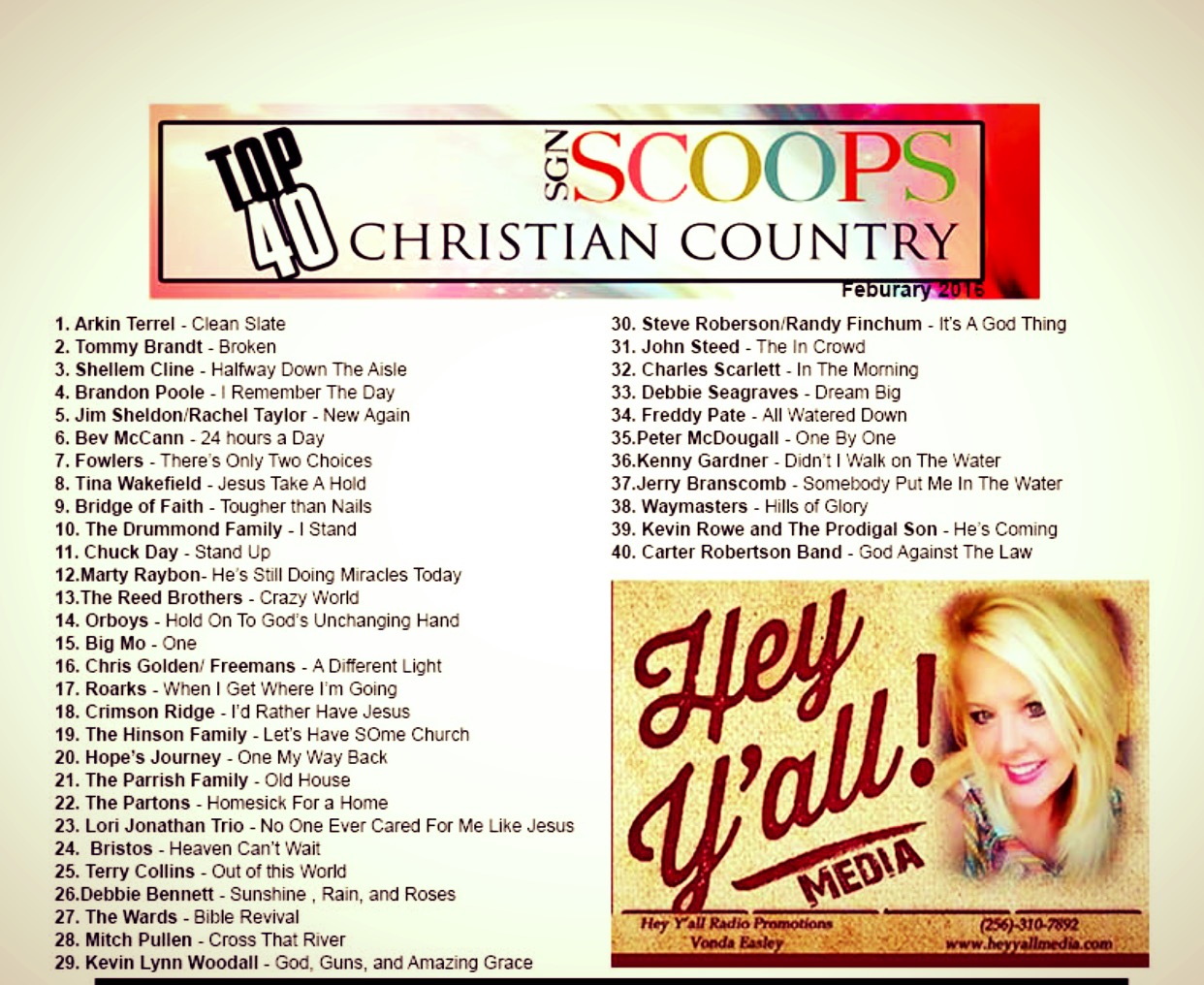 SGN Scoops is excited to premier our first top 40 Christian Country chart. We feel that the genre of Christian Country music is growing at a rapid pace and want to introduce to our readers the wonderful artist who are part of this genre