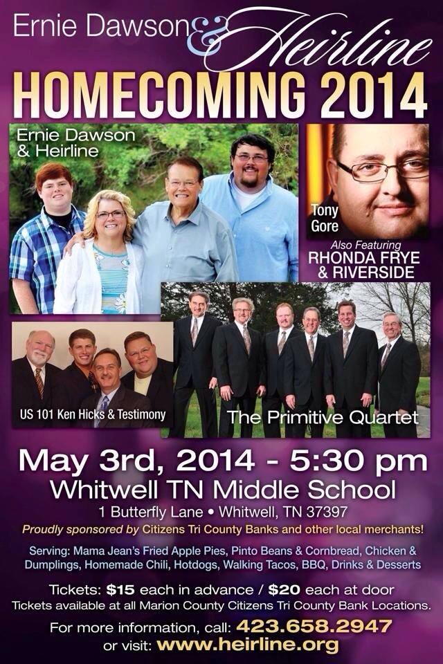 {Chattanooga, TN, May 2, 2014} Â Ernie Dawson and Heirline is set to kick off their anniversary celebration tomorrow afternoon in Whitwell, Tennessee. Â Joining Heirline in concert will be, Ken Hicks and Testimony, Tony Gore, The Primitive Quartet and Rhonda Frye and Riverside. Â Along with great music, there will be plenty of great food and fellowship. Â Tickets are $15.00 in advance and $20.00 at the door. Â Tickets are available at all Marion County Citizens Tri County Bank locations. Â For more information, visit www.heirline.org or call 423-658-2947. Â The concert starts at 5:30 CST and will be held at the Whitwell Middle School, 1 Butterfly Lane, Whitwell, Tennessee 37397.