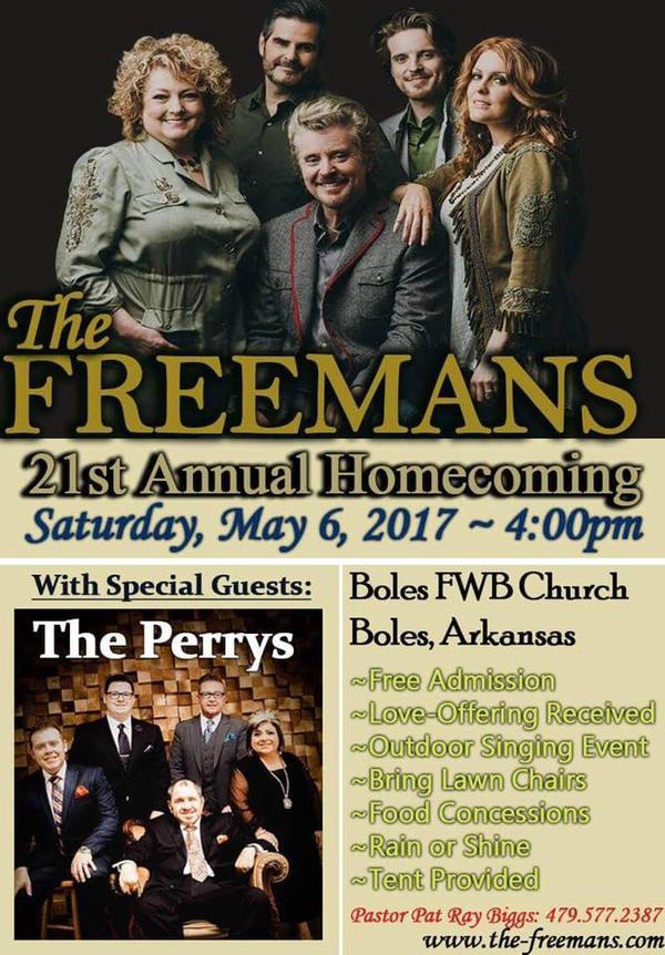 NASHVILLE, Tenn. Multi-award winning family group The Freemans are excited to announce details about their 21st Annual Homecoming concert. This year’s homecoming event will take place at Boles Free Will Baptist Church in Boles, Arkansas on Saturday, May 6, 2017.
