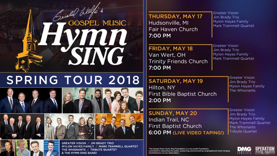 Hendersonville, TN  –The acclaimed Gospel Music Hymn Sing is gearing up to kick off its highly anticipated Spring 2018 Tour, beginning on May 17th. Led by Gerald Wolfe, this revival of classic gospel songs & beloved hymns of the church will make its way to Hudsonville, MI, Van Wert, OH, and Hilton, NY before concluding at a live DVD recording in Indian Trail, NC.