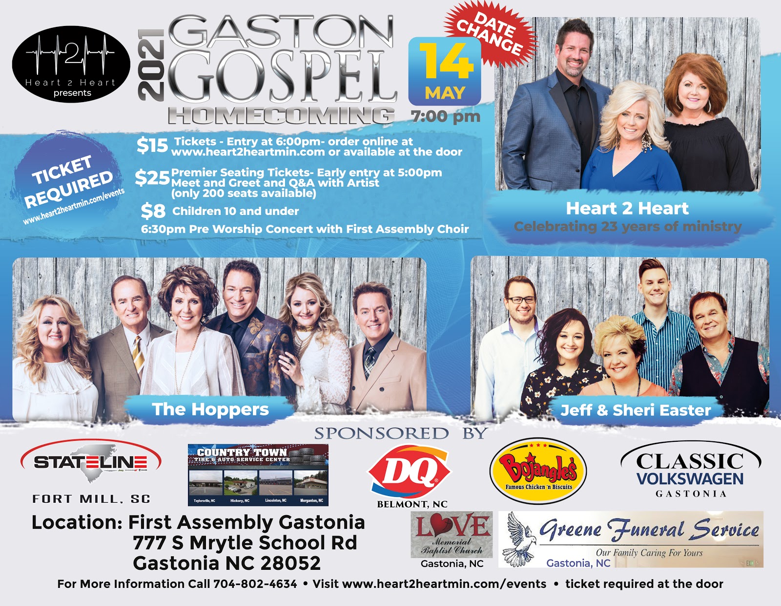 Gastonia, NC -Â Beloved North Carolina-based Southern Gospel trio, Heart 2 Heart has announced the reschedule of their 2021 Gaston Gospel Homecoming, which will celebrate their 23rd year in music ministry. Originally scheduled for January 29th, the event will now take place on May 14th.