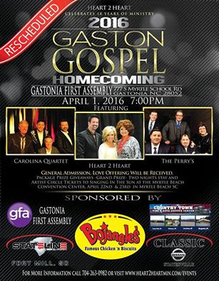 Nashville, TN -Â Don’t be fooled this April 1st by missing out on one of Southern Gospel music’s best concert events. Heart 2 Heart will host the 2016 Gaston Gospel Homecoming in Gastonia, North Carolina at Gastonia First Assembly. Joining Heart 2 Heart that night will the Perry’s, Carolina Quartet, and appearances by Les Butler and Matt Felts.