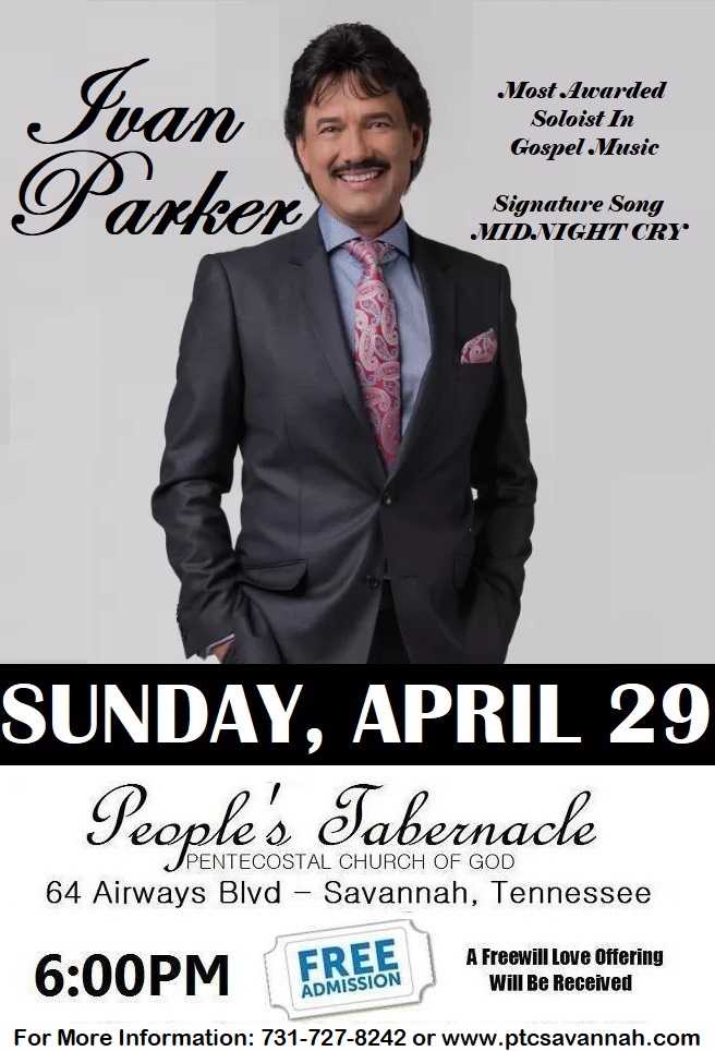 People’s Tabernacle Church, 64 Airways Blvd, Savannah, TN will welcome “IVAN PARKER”, on Sunday, April 29, 2018 at 6:00PM.