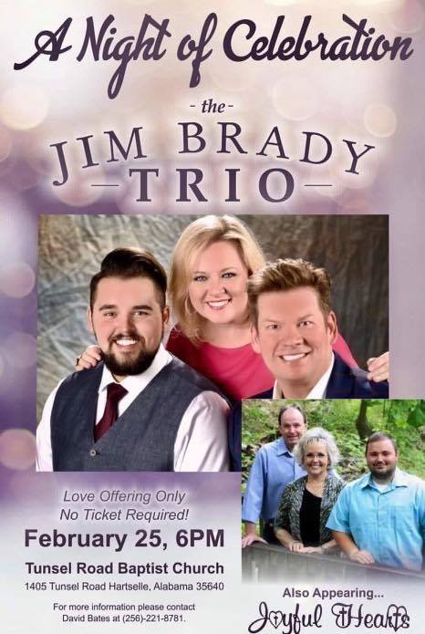 National Recording Artist The JIM BRADY TRIO will perform at Tunsel Road Baptist Church, Hartselle, Alabama on Saturday, February 25, 2017, at 6:00 PM.