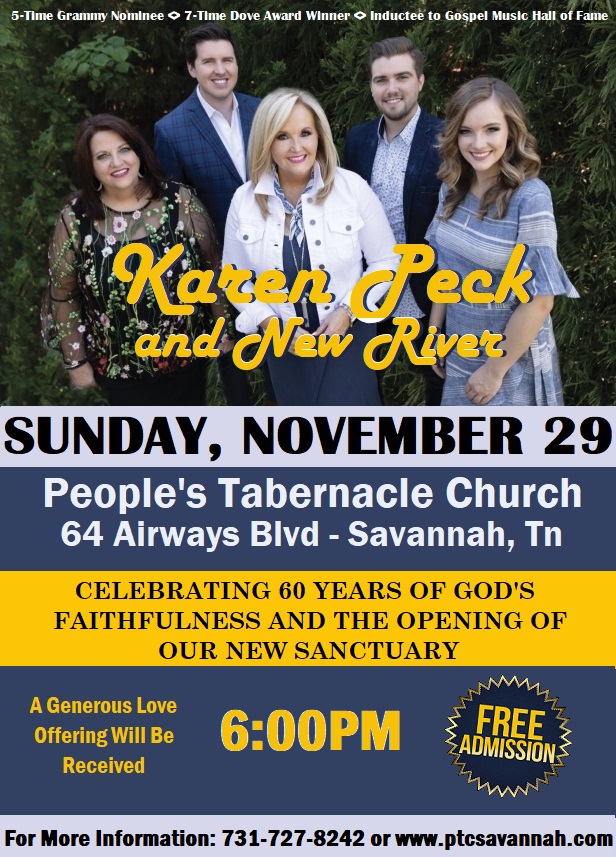 People’s Tabernacle Church, 64 Airways Blvd, Savannah, TN will welcome Dove and Grammy Award winners, “KAREN PECK & NEW RIVER”, on Sunday, November 29, 2020 at 6:00PM. Karen Peck and New River are known for hit songs such as ‘Four Days Late’ and many more! Admission is free, a generous love offering will be received. For more information, go to www.ptcsavannah.com or 731-727-8242