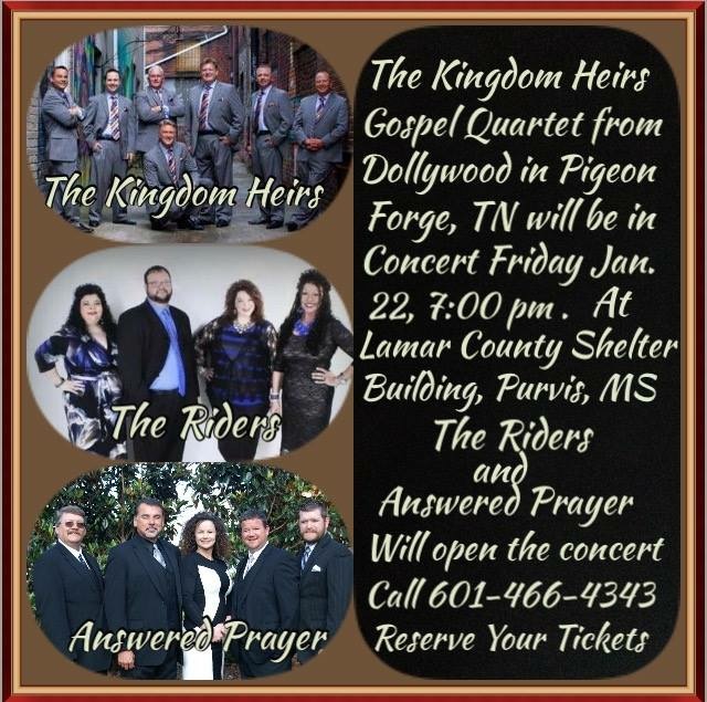 Award winning Kingdom Heirs Quartet will be in concert Friday, January 22, at 7pm, in Purvis, MS, at The Lamar County Shelter Building. Also appearing will be The Riders, and Answered Prayer. For ticket info, please call 601-466-4343. The Kingdom Heirs have a limited tour schedule so don’t miss your chance to see one of America’s premier Quartets next Friday night in Purvis, MS!!