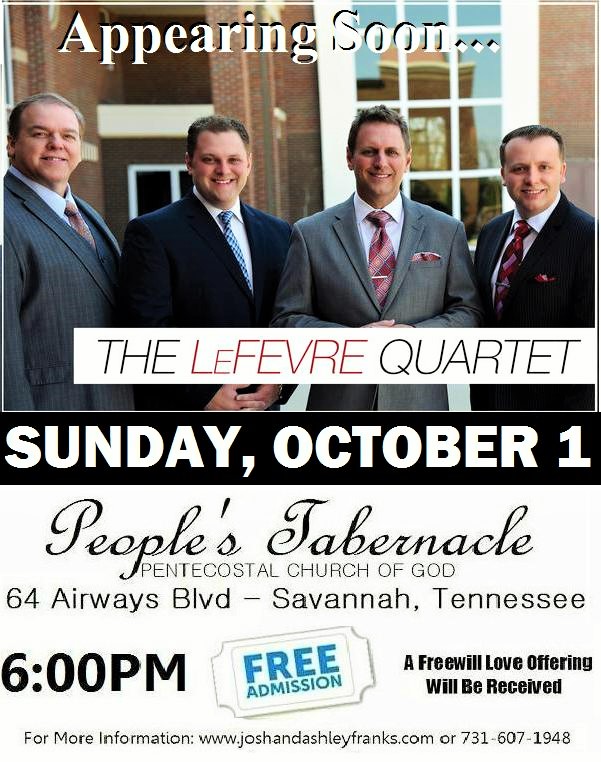 People’s Tabernacle Church, 64 Airways Blvd, Savannah, TN will welcome , “LEFEVRE QUARTET”, from Atlanta, GA on Sunday, October 1, 2017 at 6:00PM. Pastor Josh & Ashley Franks will also appear. For more information, go to www.joshandashleyfranks.com