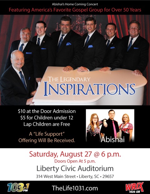 The LifeFM presents Abishai’s Homecoming concert featuring the legendary Inspirations! The concert will take place Saturday, August 27 at 6:00 P. M at the Liberty Civic Auditorium in Liberty, South Carolina. Admission is $10 at the door or $5 for children 12 years old and under. For more information visit TheLifeFM.com or call 877-700-8047.