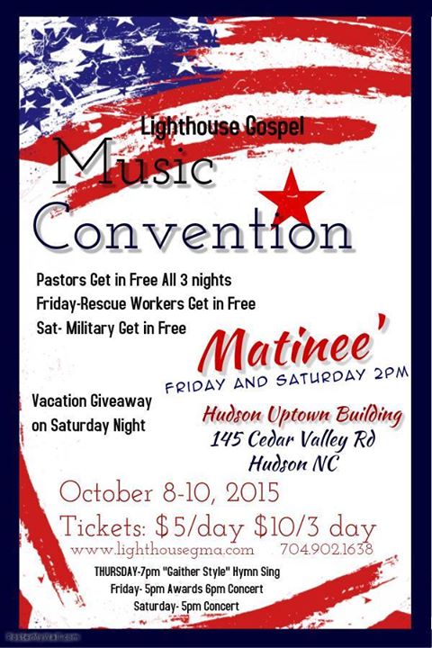 The lighthouse Gospel Music Association will be holding it’s annual convention in Hudson, NC on October 8, 9 and 10th. Twenty five gospel artist representing nine states will be performing within the three day convention. On Thursday night, the convention will kick off with a Gaither style concert featuring 15 artist and on Friday night, the annual Lighthouse Awards will take place at 5pm with the main concert immediately following. Saturday’s main concert, presented by Danshell Music Group, will begin at 5pm and will feature 5 hours of southern Gospel, Bluegrass Gospel, and Christian Country music from national, regional and local Christian Artist. LGMA has also announced a 2 hour matinee presented by MLG promotions on Friday and Saturday beginning at 2pm. Not only will fans see artist like, Shellem Cline, Higher Ground, Bev McCann and Friends, Brian Burchfield, and others, but they will get to meet representative from Industry professionals like SGN Scoops, Danshell Music Group and WCIS radio out of Morganton, NC. Tickets for the event are available at www.lighthousegma.com or by simply picking them up at the door. Tickets are only $5 a day or $10 for a 3 day pass. One ticket holder for the event will be receiving a free 3 day, 2night vacation to Pigeon Forge, TN. For more information on the annual convention call 704.902.1638.