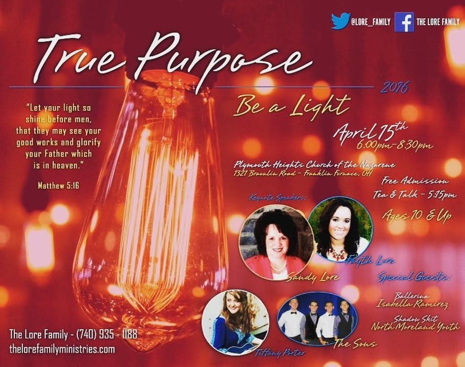 For more information on the True Purpose Conference, call the Lore Family at 740-935-1188, or go to www.