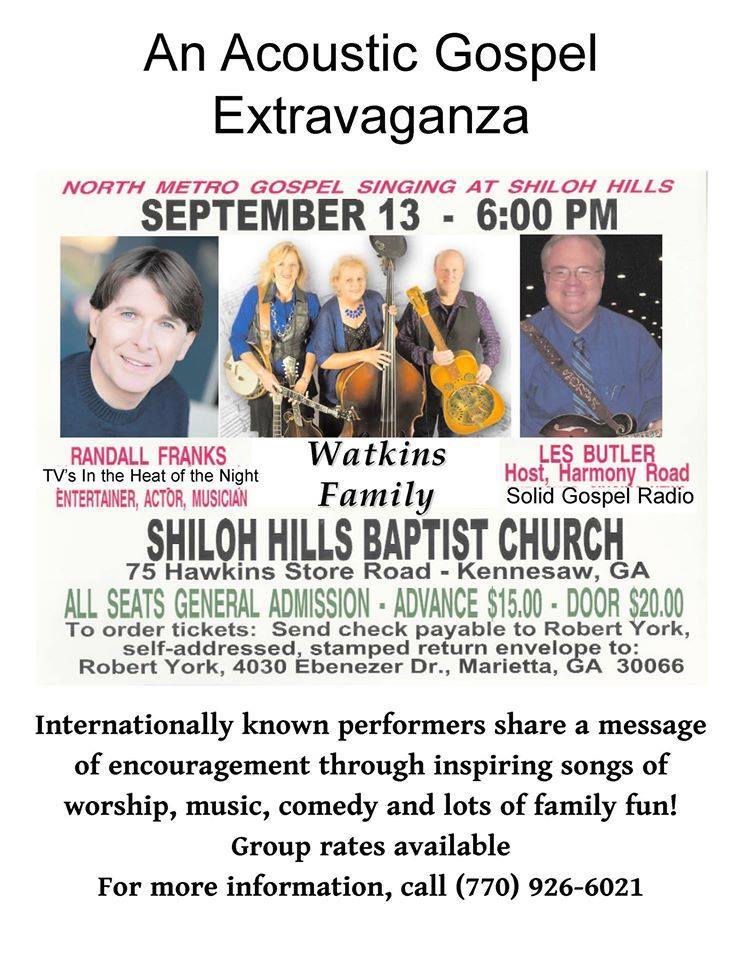 North Metro Gospel Singing Presents .. Shiloh Hills Baptist Church at 75 Hawkins Store Road in Kennesaw, Ga. will host the music ministries of former NBC and CBS star and IBMM bluegrass legend Randall Franks, “Officer Randy Goode†of TV’s “In the Heat of the Night,†acoustic Southern gospel award winning Watkins Family and Solid Gospel radio and Harmony Road TV host Les Butler on Saturday, Sept. 13, 2014 at 6 p.m. Ticket prices are $20 at the door or $15 advance and are available by sending a self-addressed stamped envelope to Robert York, 4030 Ebenezer Drive, Marietta, Ga. 30066. For more information, call (770) 926-6021.