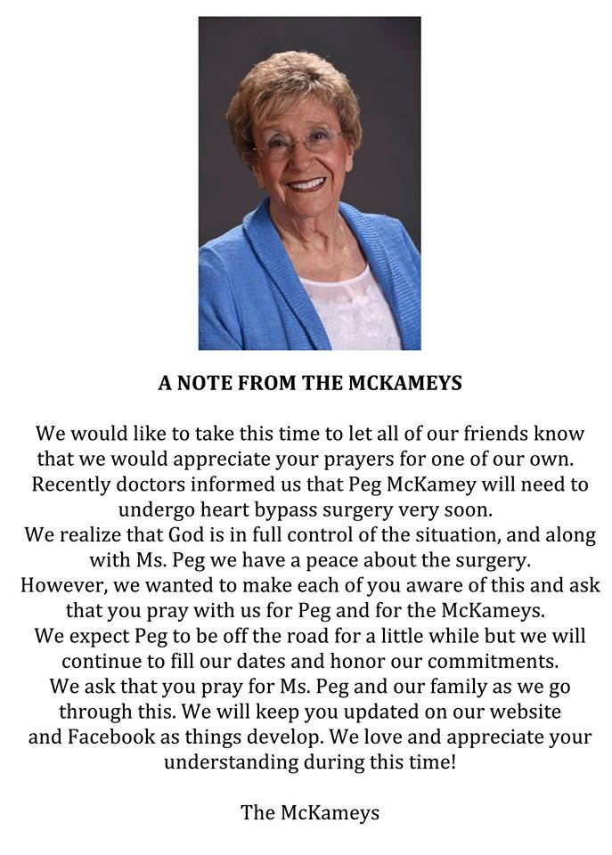 announcements Please Pray For Peg McKamey SGN Scoops Staff Dec 22, 2017 0 Please Pray For Peg McKamey Please Pray For Peg McKamey Find More Southern Gospel News HERE Peg McKameySouthern Gospel News