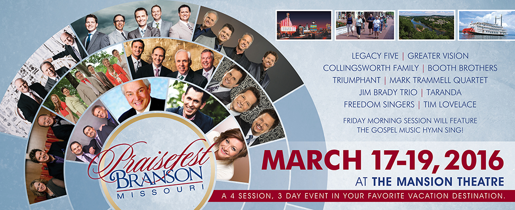 The 2016 Praisefest Branson will take place March 17, 18 & 19 and will include performances by such popular recording artists as The Triumphant Quartet, The Collingsworth Family, Greater Vision, Legacy Five, Tim Lovelace, The Booth Brothers, The Mark Trammell Quartet, The Jim Brady Trio and The Freedom Singers. In addition to nightly concerts on Thursday and Friday, morning sessions will take place on Friday and Saturday. Renown speaker, Dr. David Jeremiah, will be featured during Friday morning’s session. The weekend will also highlight brand new trio, Cana’s Voice, featuring TaRanda Greene, Doug Anderson and Jody McBrayer.