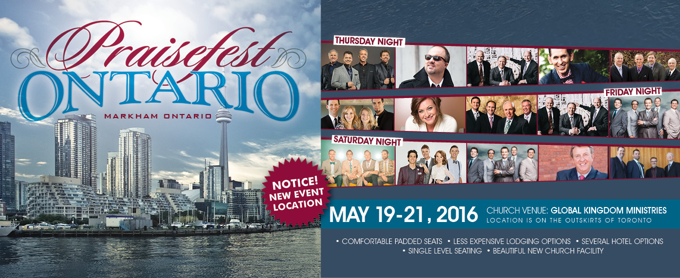 The 2016 Praisefest Niagara will take place May 19, 20 & 21 and will include performances by such popular recording artists as Ernie Haase & Signature Sound, Greater Vision, Triumphant Quartet, Legacy Five, Gordon Mote, The Erwins, Taranda Greene and many others. The event will also include wonderful showcases like the Gospel Music Hymn Sing, the Best of Ontario, as well as the only Ontario appearance of the Cathedrals Family Reunion.