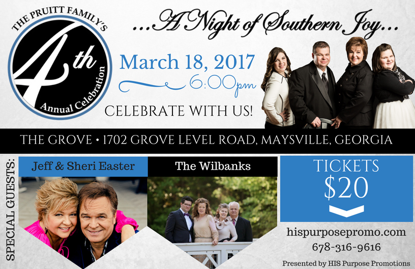Joining the Pruitt Family for this exciting night will be the Dove Award-winning Jeff and Sheri Easter and up and coming family group The Wilbanks, two groups who know how to bring the message of the Gospel in fresh and electrifying ways.