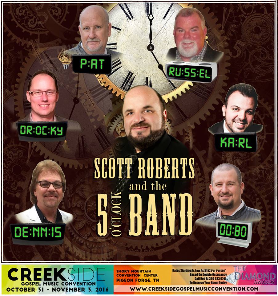SGNScoops is pleased to welcome Scott Roberts and the Five O’Clock Band to the fifth anniversary of Creekside Gospel Music Convention 2016! Combining the talents of skilled Gospel artists, Scott Roberts and the Five O’Clock Band will appear every afternoon on stage in the Smoky Mountain Convention Center, Pigeon Forge, October 31st through November 3rd.