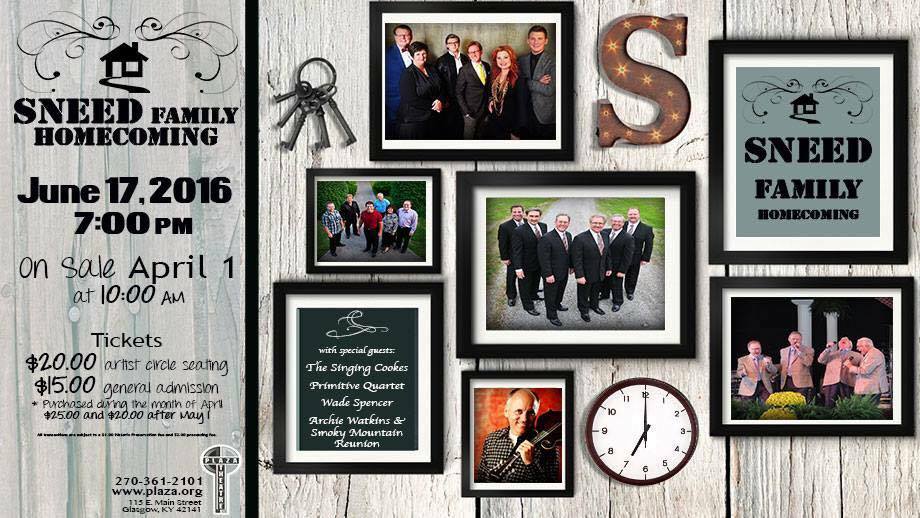 TICKETS GO ON SALE TOMORROW! The Sneed Family Homecoming Friday, June 17 @ 7:00 at the Plaza Theatre in Glasgow, Ky. Tickets go on sale April 1. Buy early in April & receive 5.00 off per ticket. Reg price is 20.00 for general admission & 25.00 artist circle. Buy in April & get 15.00 & 20.00 tickets. For tickets call 270-361-2101 or purchase on line at plaza .org. The Sneed family guest are the Primitive Quartet, Archie Watkins & Smoky Mountain, Wade Spencer, & the Singing Cookes