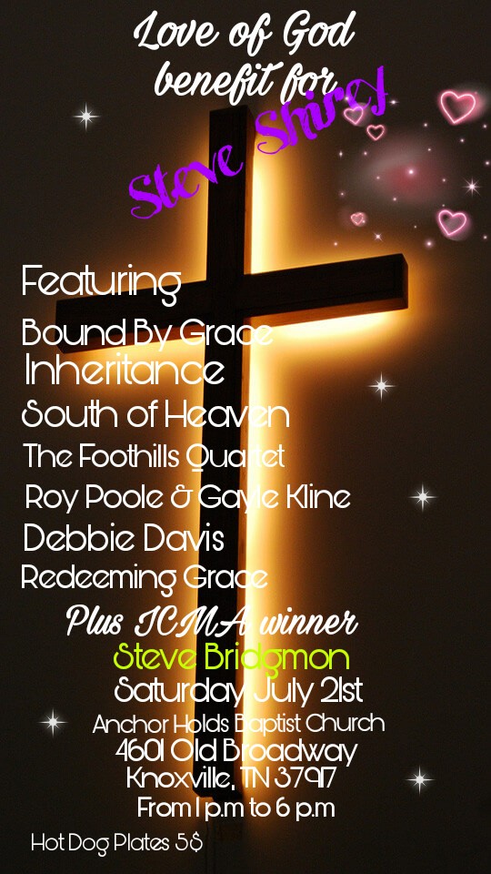 Steve Shirey a pastor and gospel artist was diagnosed with lung cancer four months ago. He has been having chemotherapy treatments and numerous x rays. As it went along, not once did Steve lose his faith or his hope that God had already healed him. As the scripture says by His stripes we are healed. We have  put together a benefit to help him. Just last month he was told he had 6 months to a year to live and to get his affairs in order. He still didn’t lose his faith that God would heal him.  Steve went to the doctor this past Friday for a CAT scan and bone test.  Monday at 11:30 a.m he went to his Dr for the test results.  Dr. said his cancer is in full remission and his bones are strong!  Steve Shirey never once felt any side effects from the chemotherapy, all he ever felt was soreness in his back!. We are having this benefit to aid him in his rising medical bills and a few more chemotherapy treatments! Please pray that we raise a lot to help our dear brother in Christ!. Thank you and God bless!.