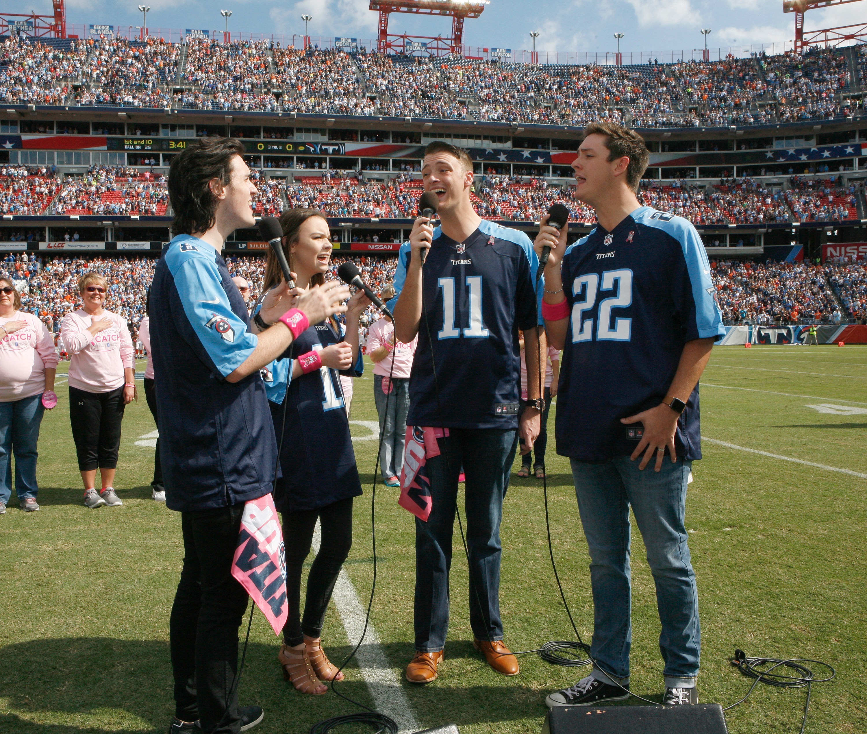 After sending in a video to the Titans for consideration, The Erwins received the invitation call in July to sing at one of the team’s home games this season. Singing in front of over 60,000 fans marked the largest ever National Anthem performance for the family quartet.
