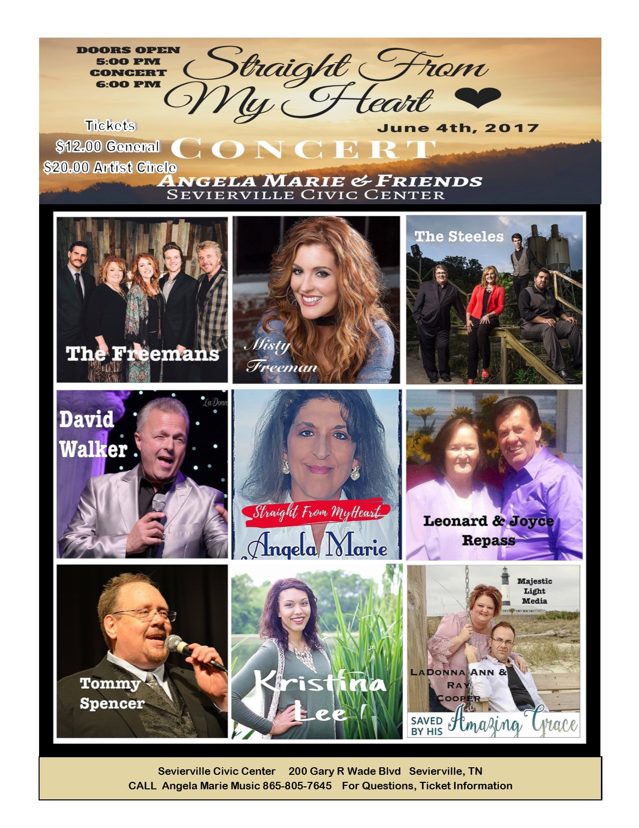Angela Marie is a christian/gospel solo artist coming back stronger than ever and ready to share new music and her ministry. Join her and her friends as some of Gospel Music’s Favorite Families and soloists share their ministries and music! In Concert will be: Angela Marie, The Freemans, Misty Freeman, The Steeles, Leonard & Joyce Repass, Tommy Spencer, David Walker, and the comedy of Ray Cooper.