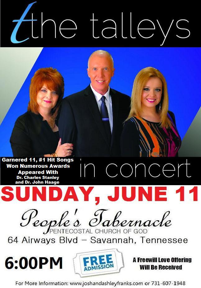 People’s Tabernacle Church, 64 Airways Blvd, Savannah, TN will welcome the award winning family group, “THE TALLEYS”, on Sunday, June 11, 2017 at 6:00PM. Pastor Josh & Ashley Franks will also appear. For more information, go to www.joshandashleyfranks.com