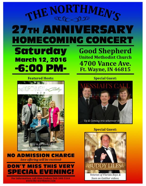 The NORTHMEN & CATHY 27 th Anniversary Homecoming Gospel Concert with Special Guest : Florida Boys Buddy Liles as seen on Gaither Videos – and – Messiah’s Call upcoming Midwest trio . Saturday March 12th 2016 at 6:00PM GOOD SHEPHERD United Methodist Church 4700 Vance Av. Fort Wayne , IN. For More Info : Alan Godsey 260 348 5164 www.the-northmen.com