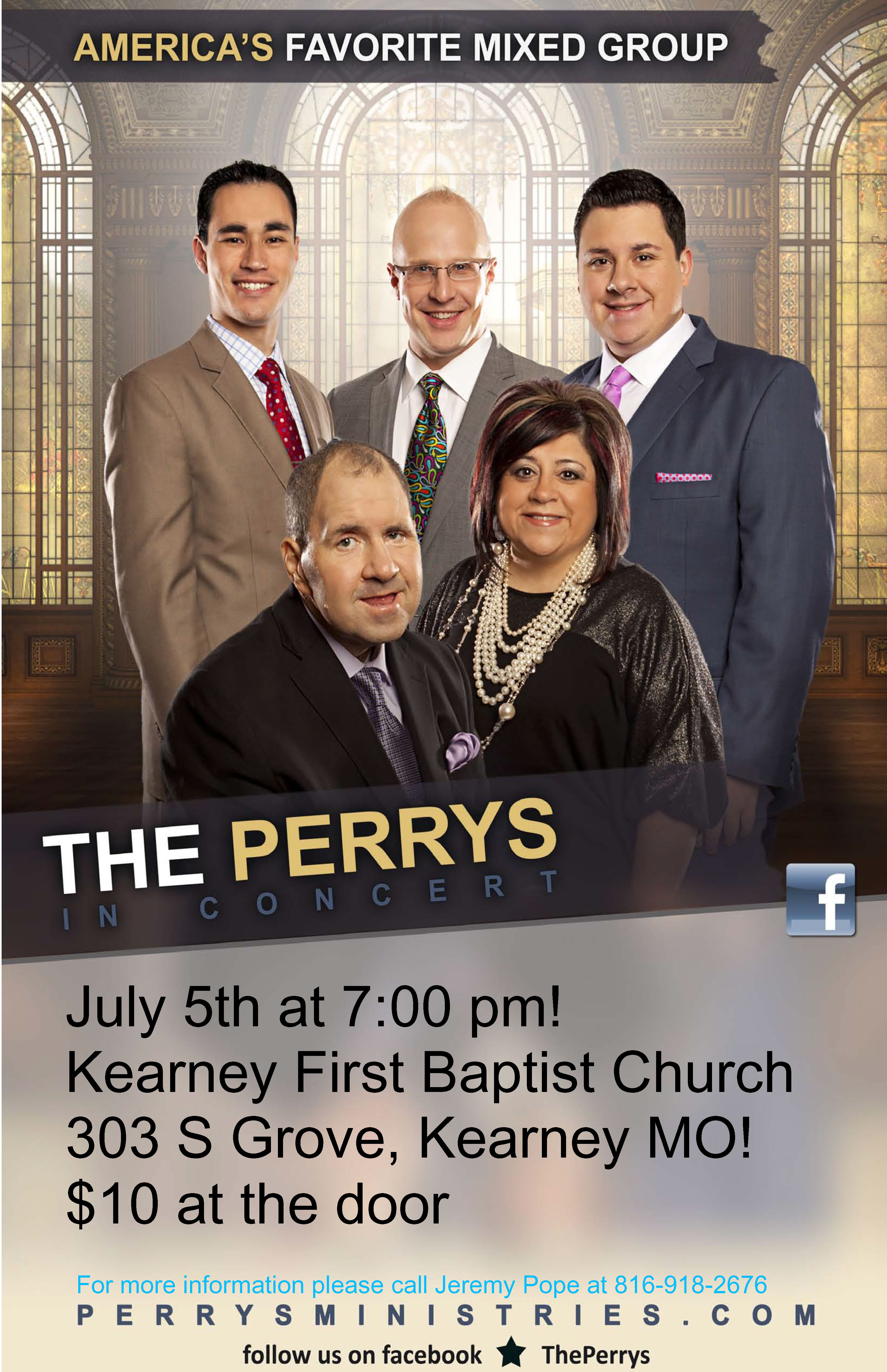 announcements The Perry’s at First Baptist Church in Kearney MO SGN Scoops Staff Jun 18, 2014 0 Please come see The Perry’s at First Baptist Church in Kearney MO on the 5th of July at 7:00 pm. Admission is $10 at the door. For more information please call Jeremy Pope at 816-918-2676 Kearney MoSouthern Gospel ConcertSouthern Gospel Musicthe perrys