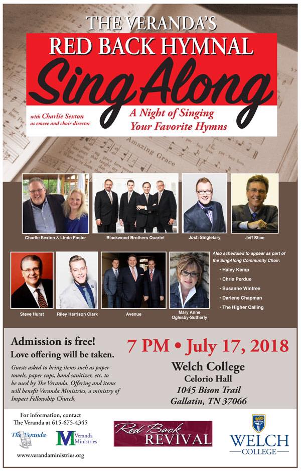 Nashville, Tenn – Veranda Ministries invites area churches to “The Veranda’s Red Back Hymnal SingAlong†on July 17 at Welch College in Gallatin, Tennessee.