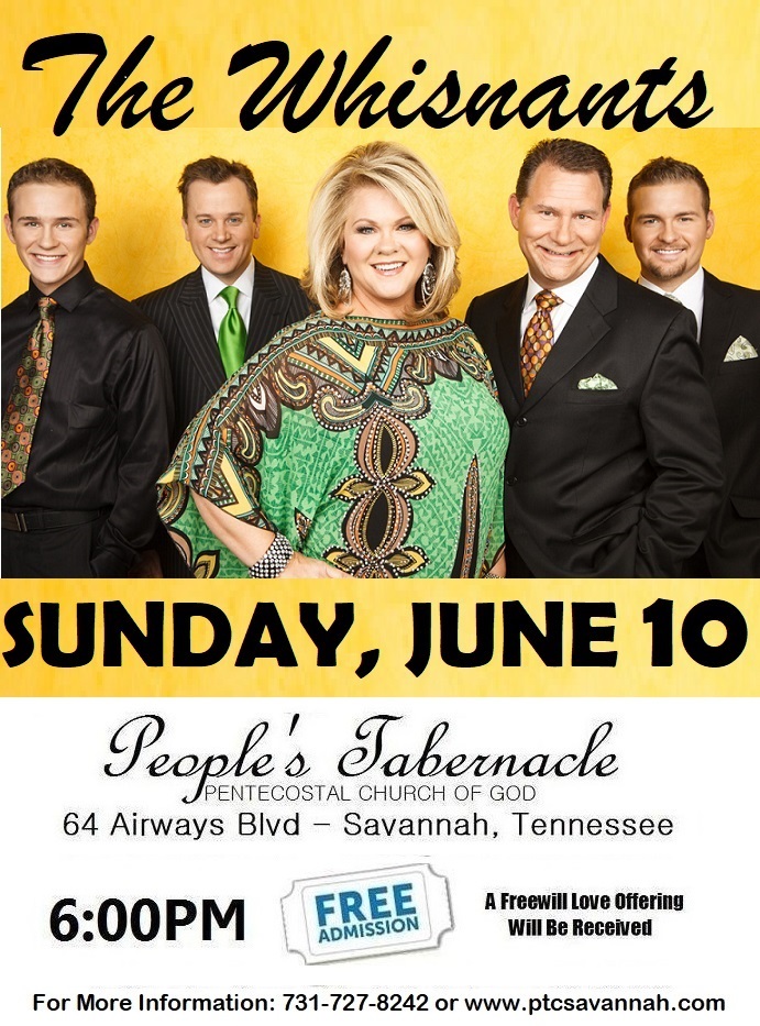 People’s Tabernacle Church, 64 Airways Blvd, Savannah, TN will welcome, “THE WHISNANTS”, on Sunday, June 10, 2018 at 6:00PM.