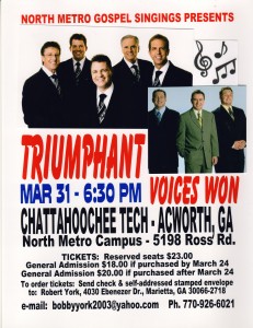 TRIUMPHANT QUARTET and VOICES WON will be in concert March 31 – 6:30 pm at Chattahoochee Tech (North Metro Campus) 5198 Ross Road, Acworth, GA.  RHONDA FRYE editor-in-chief of SGNScoops digital magazine will be the emcee for the evening.