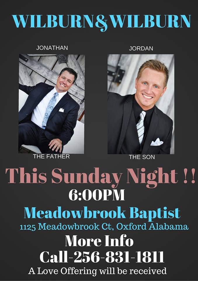 Wilburn and Wilburn: We want to invite everyone out this Sunday night to Meadowbrook Baptist in Oxford Alabama. We start at 6:00. It may be a little cold out but we are expecting a night warmed by the Spirit of God. Don’t miss this night with Wilburn and Wilburn!
